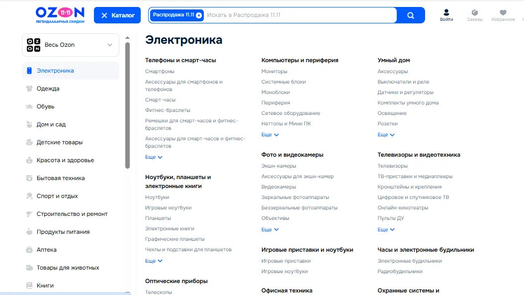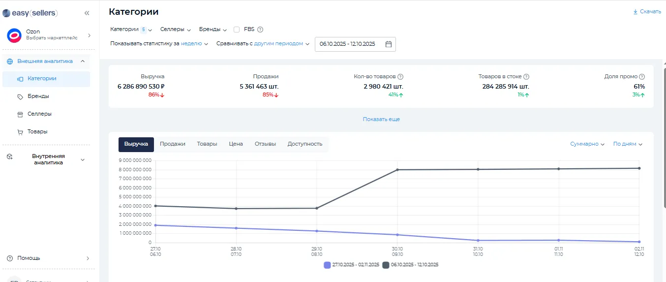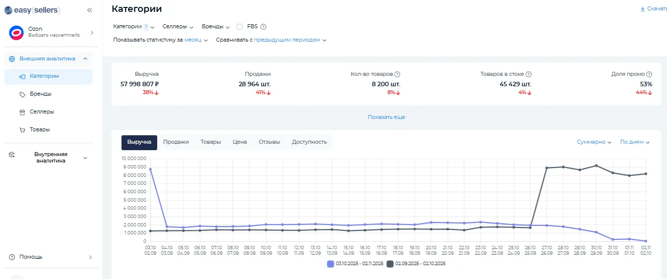 Чтобы увидеть полный перечень категорий и подкатегорий, необходимо зайти в каталог. Внутри каждой категории находится дерево подкатегорий, что удобно для пользователей и полезно для поисковой оптимизации. Аналогичные подкатегории для выгрузки подробной аналитики по узким группам продуктов раскрываются в настройках сервиса Easy Sellers Tool.