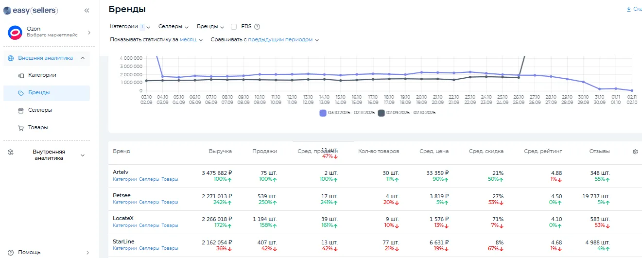 расширенная аналитика с популярными инструментами, такими как «Товары в поиске», «Тренды», «Конкурентная позиция». Внутренняя аналитика маркетплейса необходима для поиска точек роста и увеличения прибыли.