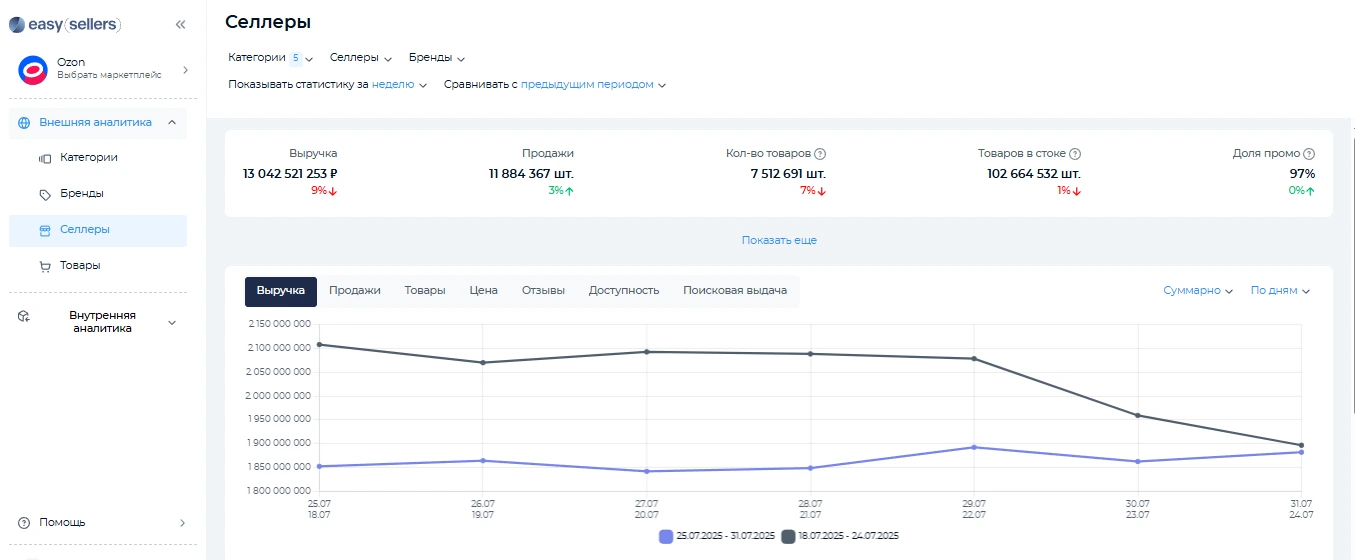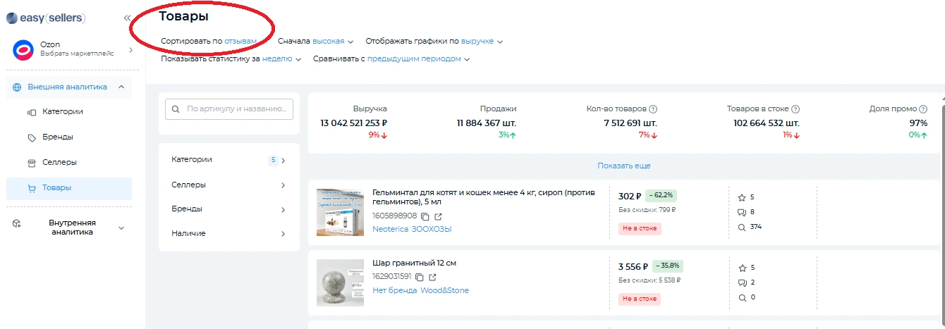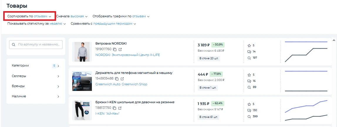 Благодаря сервису аналитики селлер может увидеть всю «внутреннюю кухню» продаж и использовать полученную информацию для развития дела. В Easy Sellers Tool есть специальный фильтр для сортировки товаров по отзывам. Эта настройка помогает выявлять товары с самым большим количеством комментариев пользователей за выбранный период. Опция сравнения данных с предыдущим периодом важна при оценке изменений спроса.