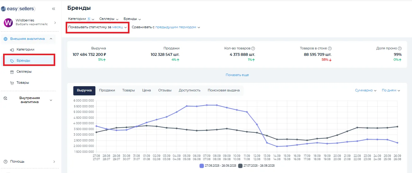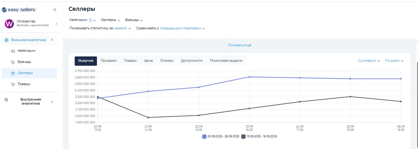 В отчете «История остатков» по умолчанию данные выгружаются за прошедшую неделю. В настройках можно выбрать другой период. В личном кабинете селлера доступны данные за последние 3 месяца. Для отслеживания трендов этой глубины просмотра бывает недостаточно. Чтобы ограничения в настройках не мешали анализировать бизнес-процессы, воспользуйтесь функционалом Easy Sellers Tool. В сервисе можно выбрать любой период для сравнения ключевых метрик. Это удобно при оценке сезонности и других трендовых явлений.
