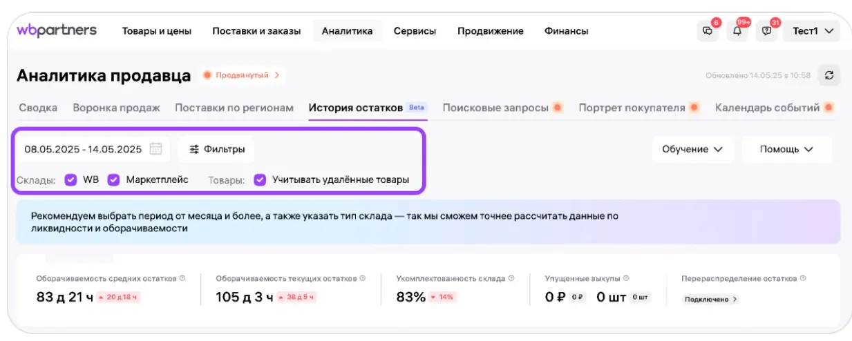 В идеальном случае процент выкупа достигает 90%, но это редкость. Показатель постоянно снижается из-за растущего числа возвратов, обусловленных разными причинами. Чтобы повысить количество продаж, необходимо мониторить историю возвратов и отказов, а также следить за остатками товара на складе. Для этого можно использовать отчет «История остатков» на Вайлдберриз. Данные из этого отчета помогают продавцу решать следующие задачи: