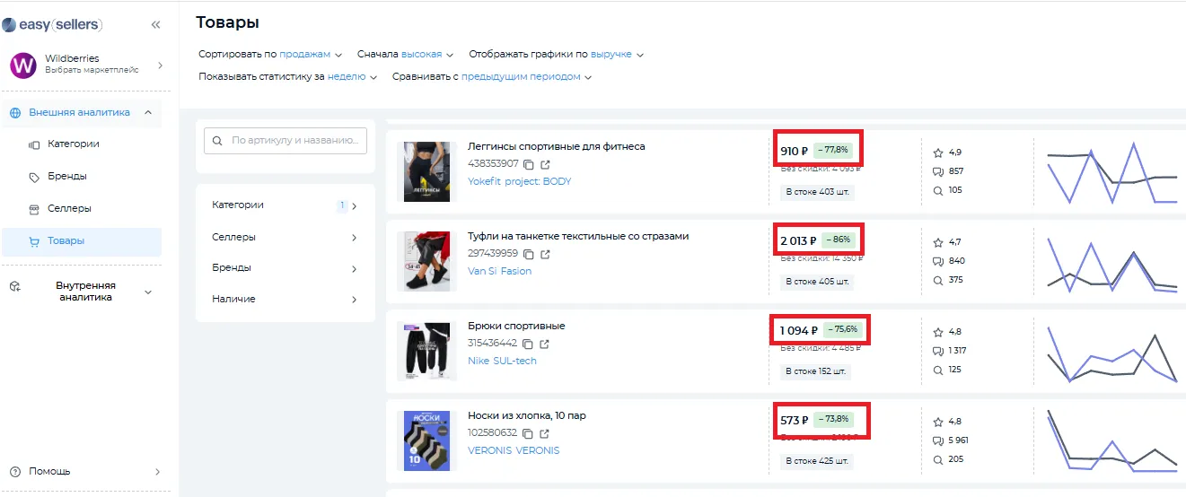 Каждый возврат — дополнительные расходы для продавца. Доставку продукции обратно на склад приходится оплачивать. Есть и другие нюансы, связанные с отказами. Чтобы выявить проблемные моменты, необходима аналитика продаж. Easy Sellers Tool — незаменимая аптечка с готовым набором актуальных данных для внешней и внутренней аналитики на маркетплейсах. С аналитикой от Easy Sellers продавец всегда в курсе, какие товары наиболее востребованы у покупателей, что приводит к отказам и как обстоят дела с продажами у конкурентов.