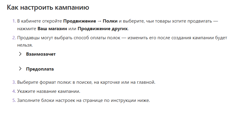 Полка подходит для получения первых заказов на новые позиции, а также для роста продаж востребованных артикулов из ассортимента селлера. В выдаче полка занимает 1-ю, 4-ю и 10-ю позиции, место показа выбирает продавец в настройках кампании. Как и в случае с бустом, селлер платит за продвижение чуть больше ставки ближайшего конкурента. Особенности полки: