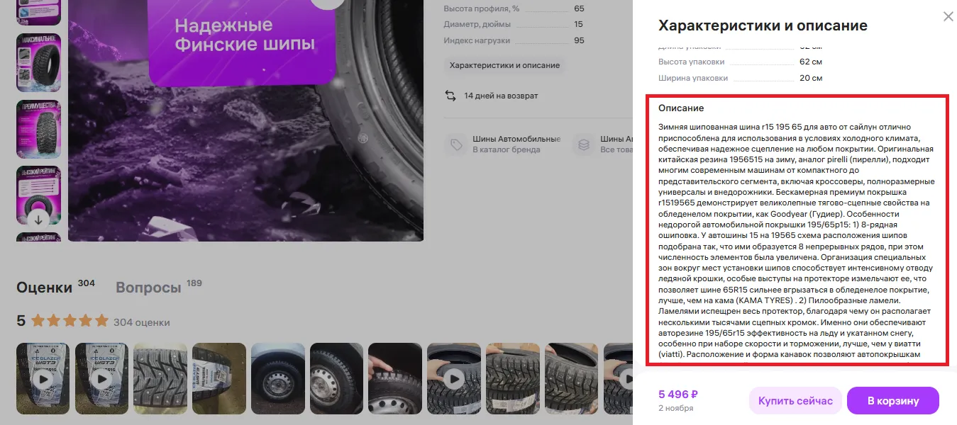 Описание важно для людей и алгоритмов. Чтобы получить показы по релевантным запросам, необходимо добавлять ключевые слова и фразы в текст описания. Покупателю описание поможет понять, насколько ему подходит предлагаемый продукт. Выводить на маркетплейс карточки без текстового сопровождения не следует.