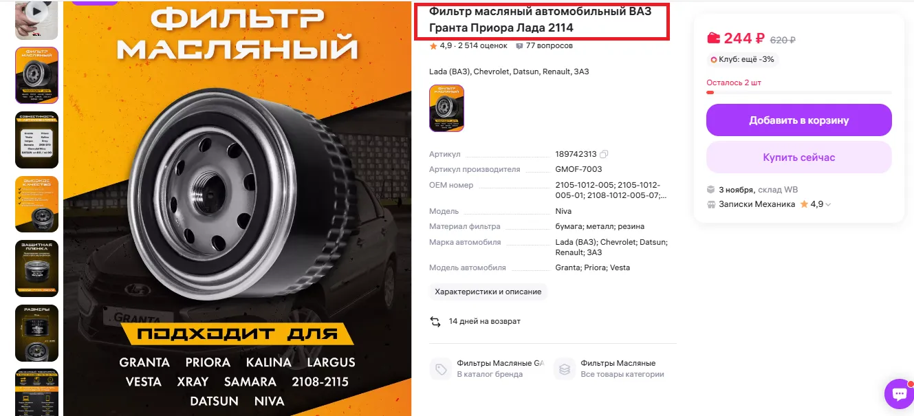 Ниже представлен товар с удачным наименованием. По названию пользователи сразу понимают, подходит ли им артикул, что упрощает продвижение и повышает конверсию просмотров в заказы.